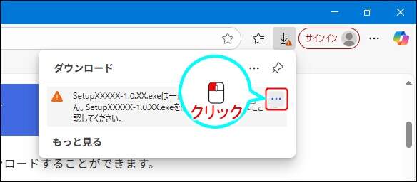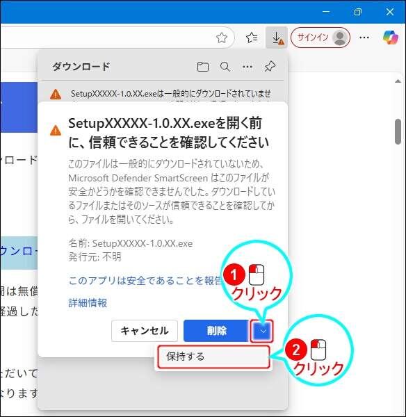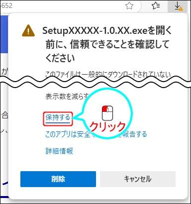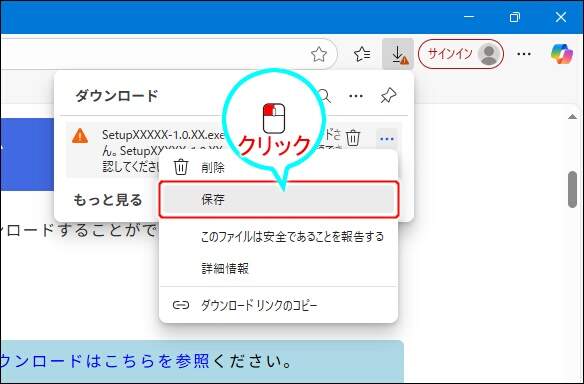 Microsoft Edgeをご利用の場合には、以下のように警告メッセージが表示されダウンロードが中断されることがあります。