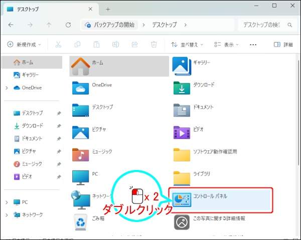 最上位のフォルダには "コントロールパネル" が表示されますので、ダブルクリックしてコントロールパネルを開きます。