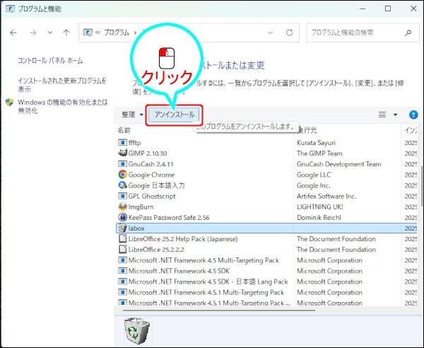 プログラムと機能が表示されますので、一覧から "labox" を選択します。